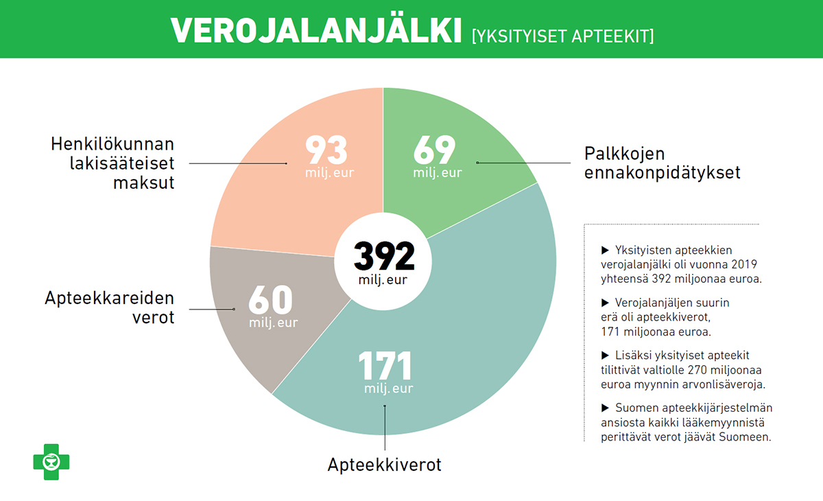 Verojalanjäljen suurin erä olivat apteekkiverot. Apteekkiveron lisäksi apteekkarit maksoivat veroja yhteensä 60 miljoonaa euroa.
