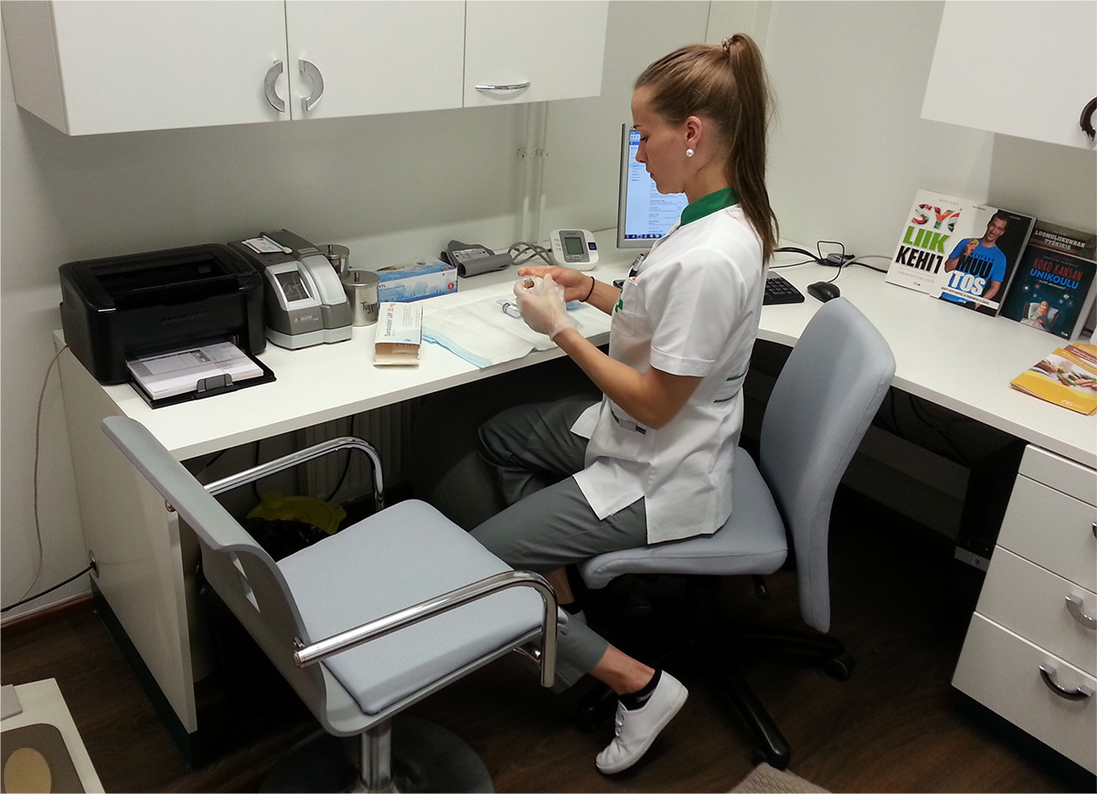 Oulun Hansa Apteekin terveydenhoitaja Susanna Slunga hoitaa esimerkiksi pikkuhaavereita, poistaa ihosta punkkeja, tikkejä ja tikkuja, sekä antaa matkailijoille rokotuksia. Syvät ja vuotavat haavat, kyyn puremat ja muut vaativammat tapaukset ohjataan terveyskeskuksen päivystykseen.