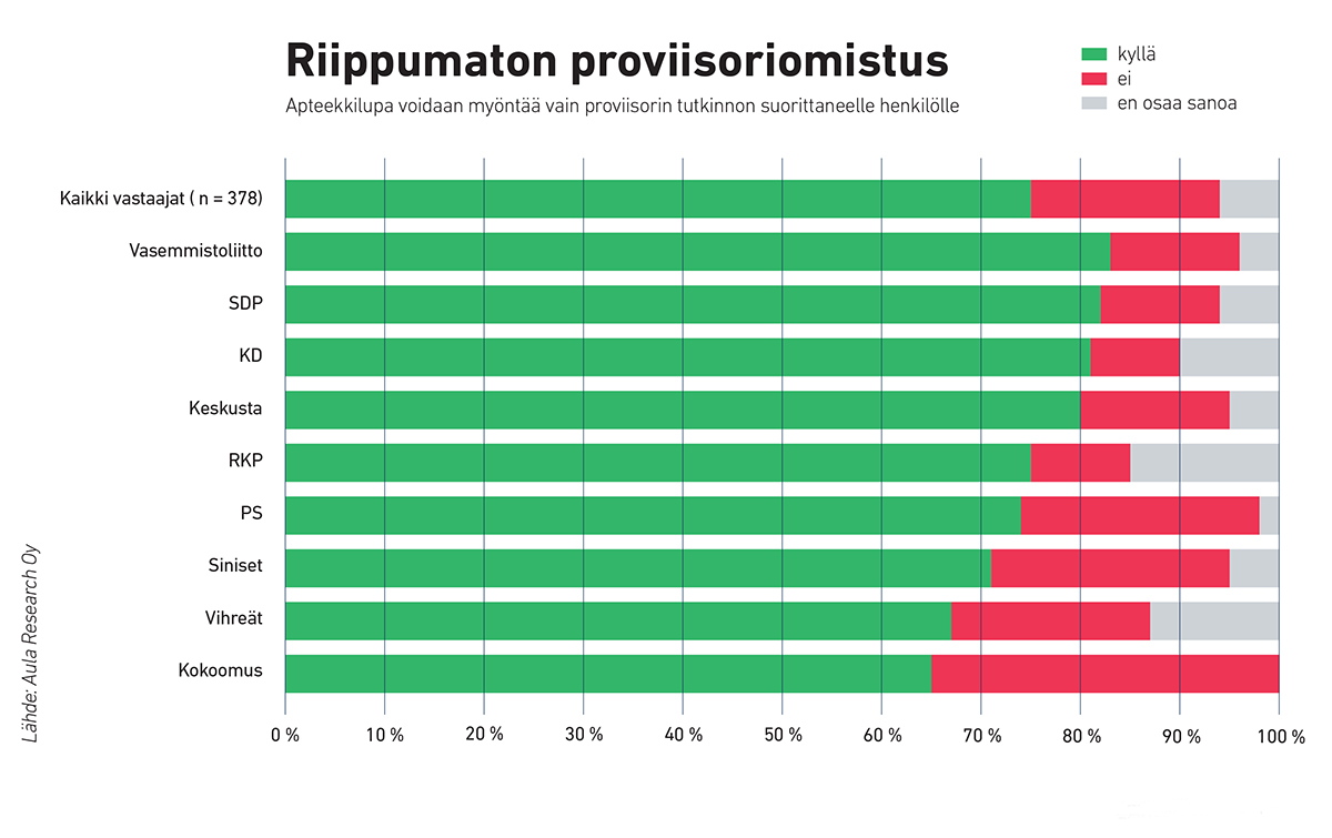 Kolme neljästä kansanedustajaehdokkaasta on sitä mieltä, että apteekkien toiminnan tulee jatkossakin perustua riippumattomaan proviisoriomistukseen. Toisin sanoen apteekkilupa voidaan myöntää vain proviisorin tutkinnon suorittaneelle henkilölle. Lähes yhtä moni (73 %) katsoo, että apteekkilupien määrää tulee kuitenkin lisätä.