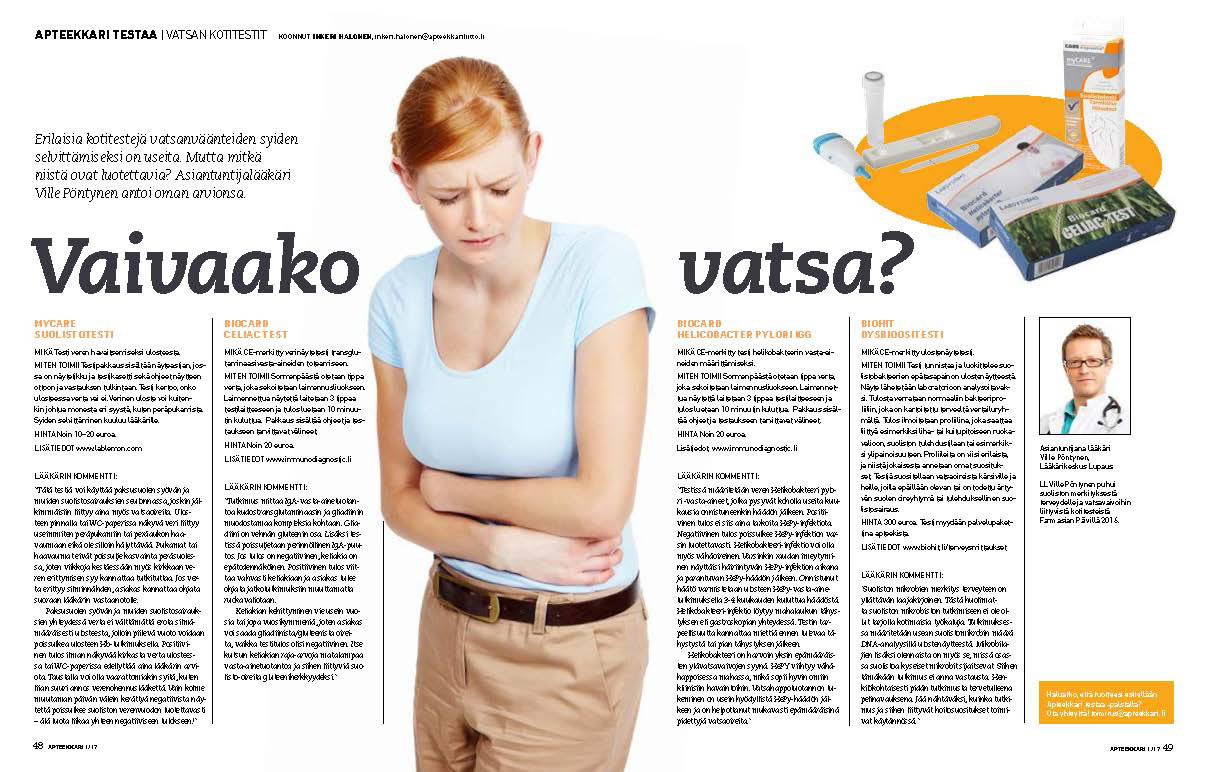 Helikobakteeritestiä koskevassa tekstissä mainittiin virheellisesti, että ”Onnistunut häätö varmistetaan ulosteen HePy-vasta-ainetutkimuksella”. Häätö varmistetaan ulosteen antigeenitutkimuksella.