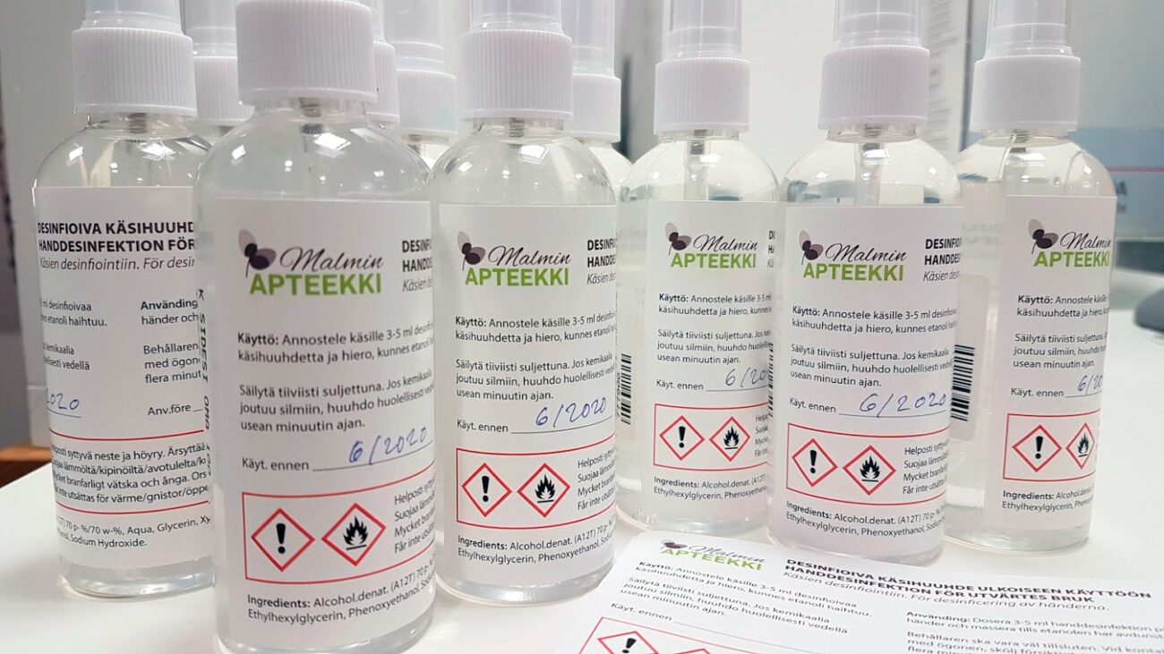 Apteekkari on tarvinnut kekseliäisyyttä myös muiden raaka-aineiden kanssa. Kun tukuista ei saanut denaturoitua etanolia, hän haki alkoholia suoraan Altian tehtaalta. Sitten loppui puhdistettu vesi, jonka valmistuksessa hän sai kollegiaalista apua.