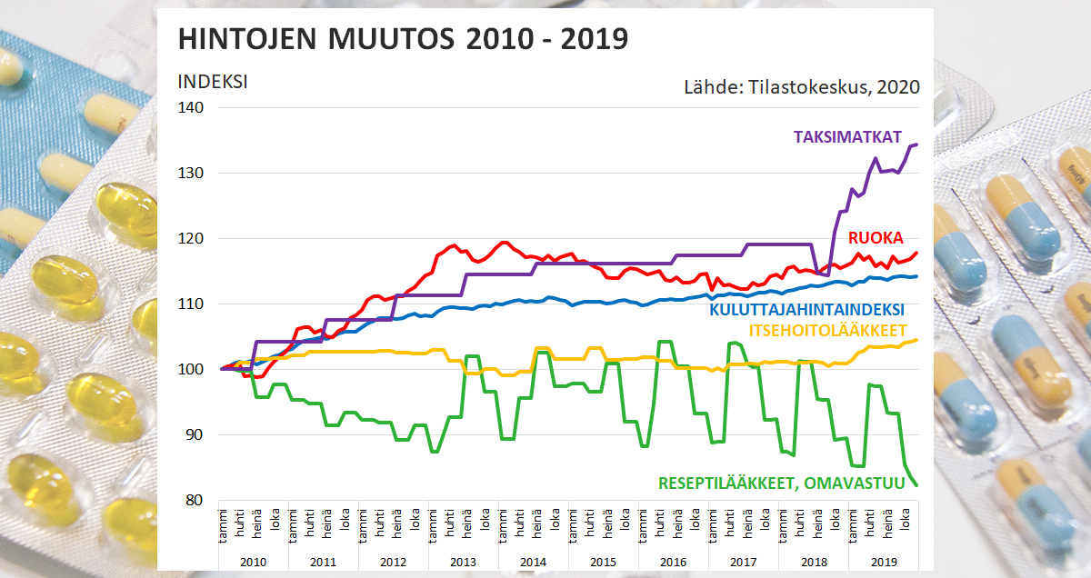 Tilastokeskuksen mukaan reseptilääkkeiden kuluttajahinnat eli lääkkeistä maksetut omavastuut laskivat liki 18 prosenttia tammikuusta 2010 joulukuuhun 2019.