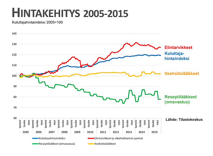 Kuluttajahintaindeksin, ruoan ja lääkkeiden hintakehitys 2005–2015.