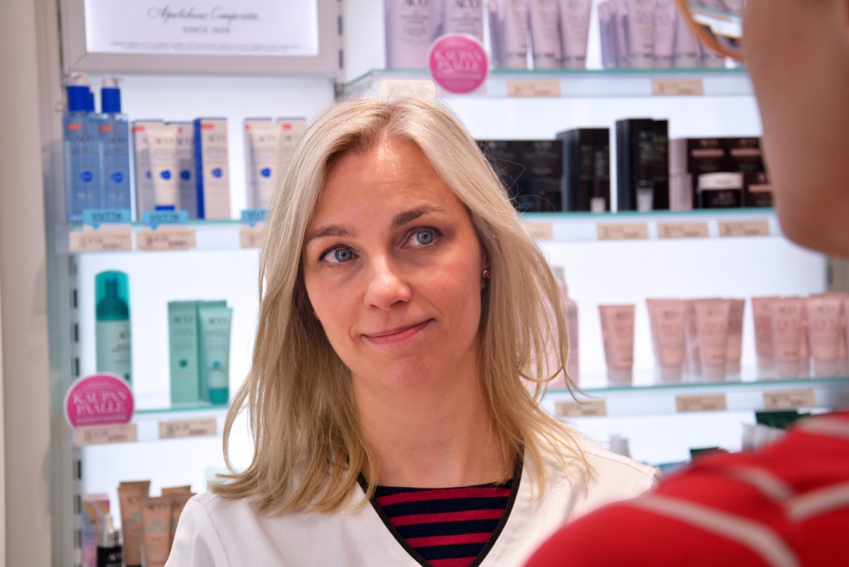 Nyströmin edellinen kokemus apteekkityöstä oli oppilasharjoittelusta, ajalta ennen e-reseptiä. Tiskin taakse paluu pelotti, mutta hän tsemppasi itseään.